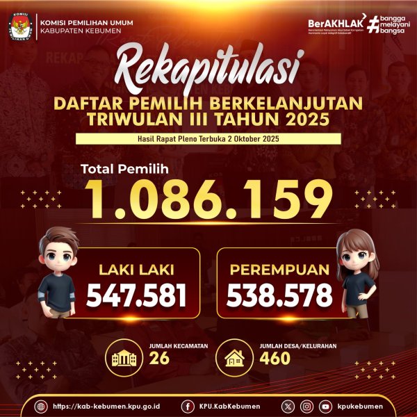 Rekapitulasi Daftar Pemilih Berkelanjutan Triwulan III Tahun 2025, dengan jumlah pemilih 1.086.159 dengan jumlah pemilih laki-laki sejumlah 547.581 dan pemilih perempuan sejumlah 538.578 yang tersebar di 26 Kecamatan dan 460 Kelurahan/Desa di seluruh wilayah Kabupaten Kebumen.