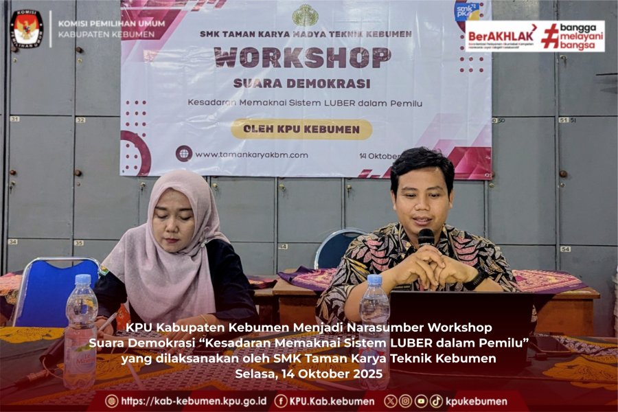 KPU Kabupaten Kebumen kembali melaksanakan kegiatan pendidikan pemilih dengan menjadi narasumber dalam Workshop Suara Demokrasi bertema “Kesadaran Memaknai Sistem LUBER dalam Pemilu” yang digelar di SMK Taman Karya Teknik Kebumen, pada Selasa 14 Oktober 2025.