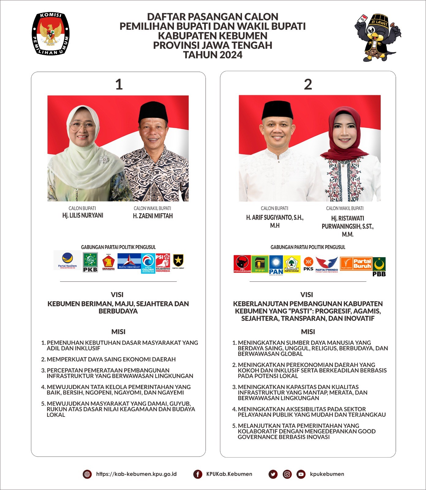 Daftar Pasangan Calon Pemilihan Bupati dan Wakil Bupati Kebumen 2024, calon dengan nomor urut 1 Hj. Lilis Nuryani dan H. Zaeni Miftah, calon dengan nomor urut 2 H. Arif Sugiyanto, S.H.,M.H dan Hj. Ristawati Purwaningsih, S.ST.,MM. Daftar Pasangan Calon berisi nomor urut, visi dan misi pasangan calon