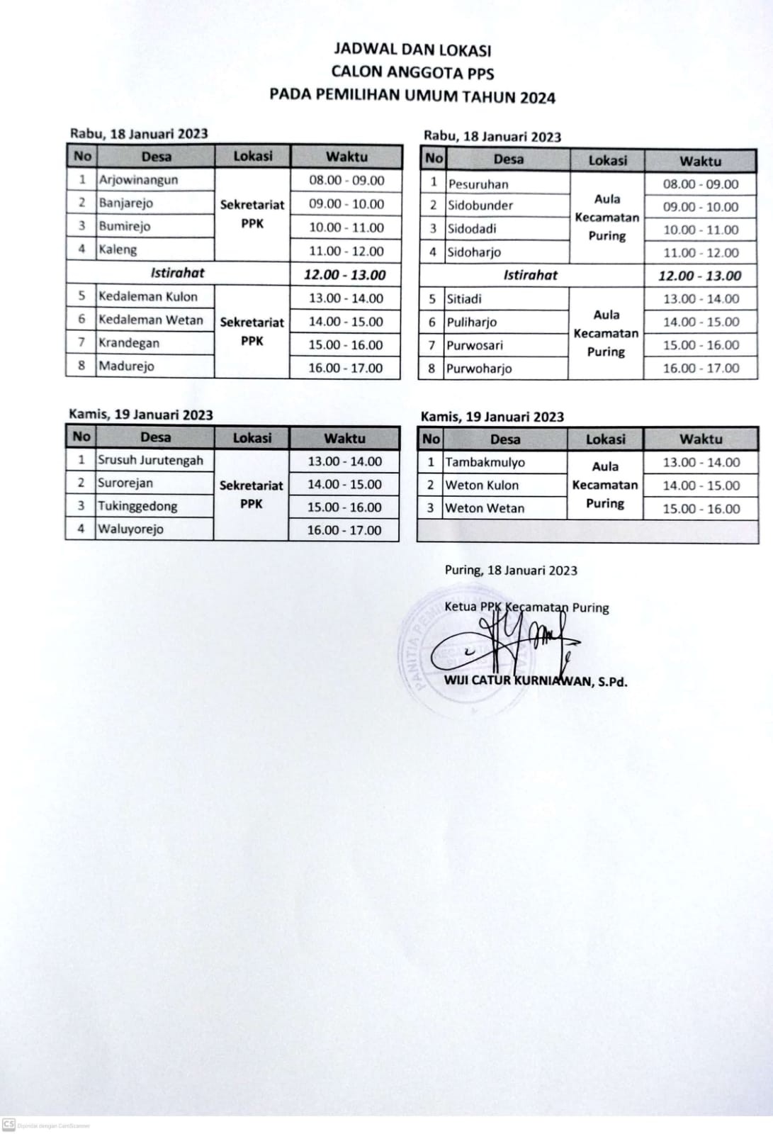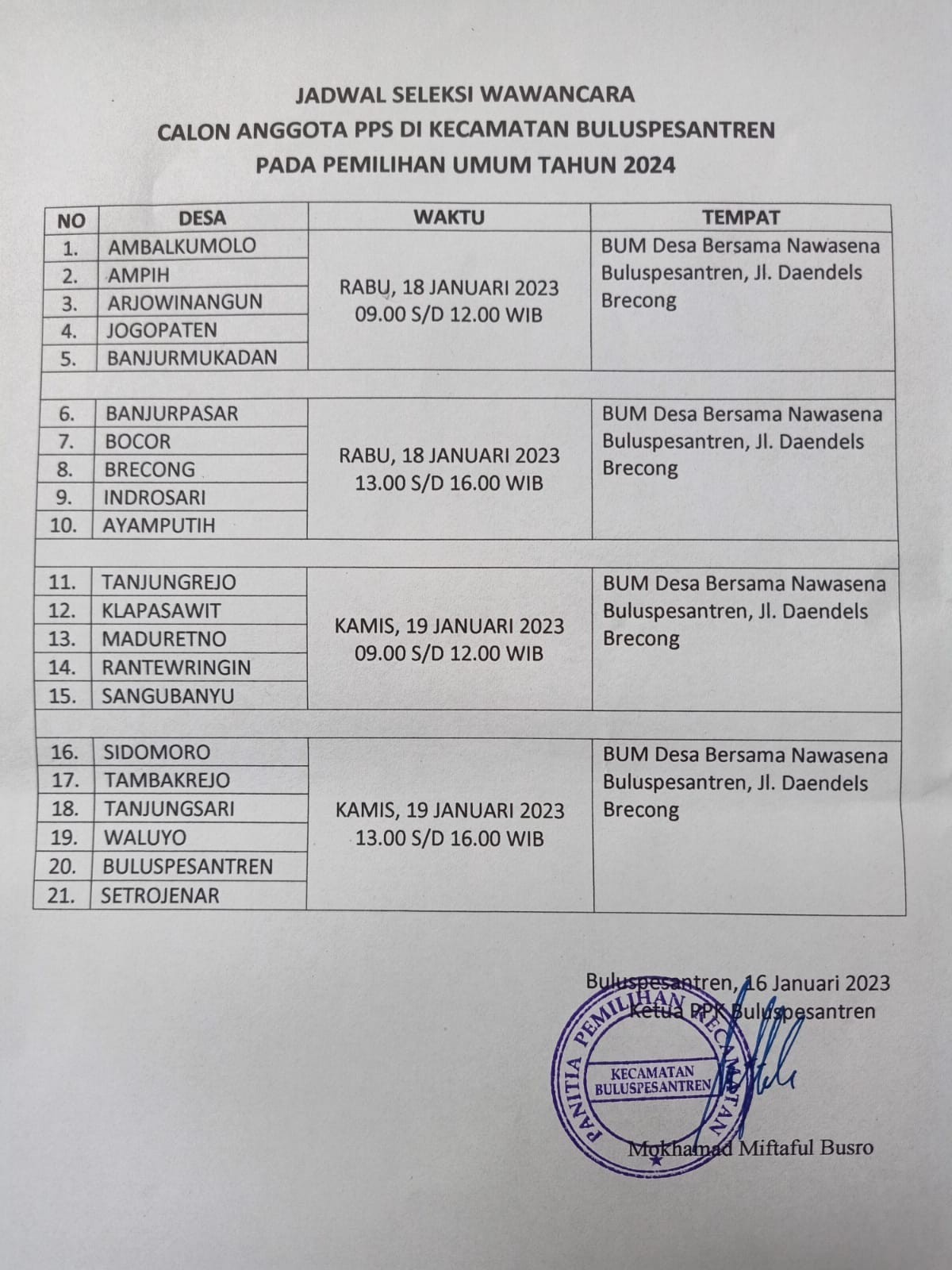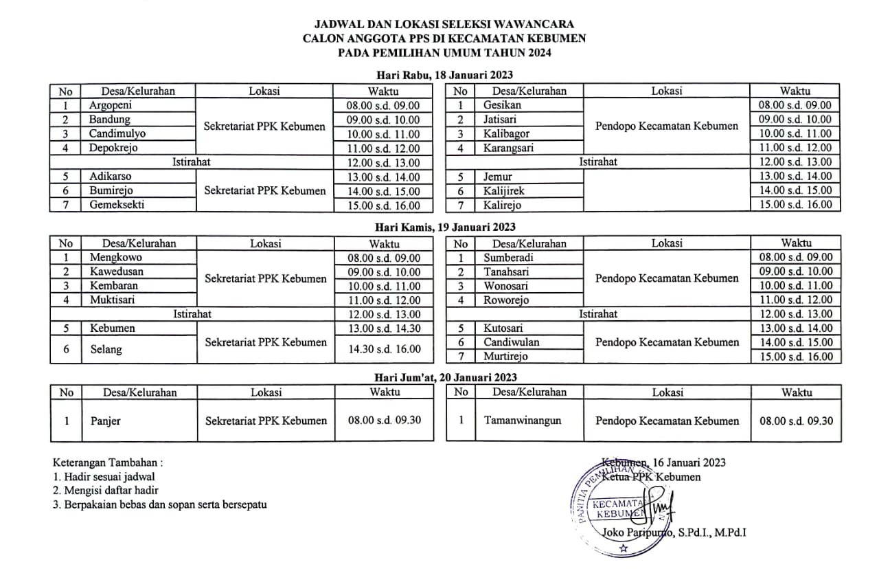 Sehubungan dengan hal tersebut di atas, KPU Kabupaten Kebumen mengundang calon anggota Panitia Pemungutan Suara yang dinyatakan Lulus tahap seleksi tertulis untuk hadir dalam Seleksi Wawancara bertempat di masing – masing Kantor Sekretariat Panitia Pemilihan Kecamatan (PPK) pada tanggal 18 – 20 Januari 2023 sesuai jadwal yang ditetapkan oleh Panitia Pemilihan Kecamatan (PPK).