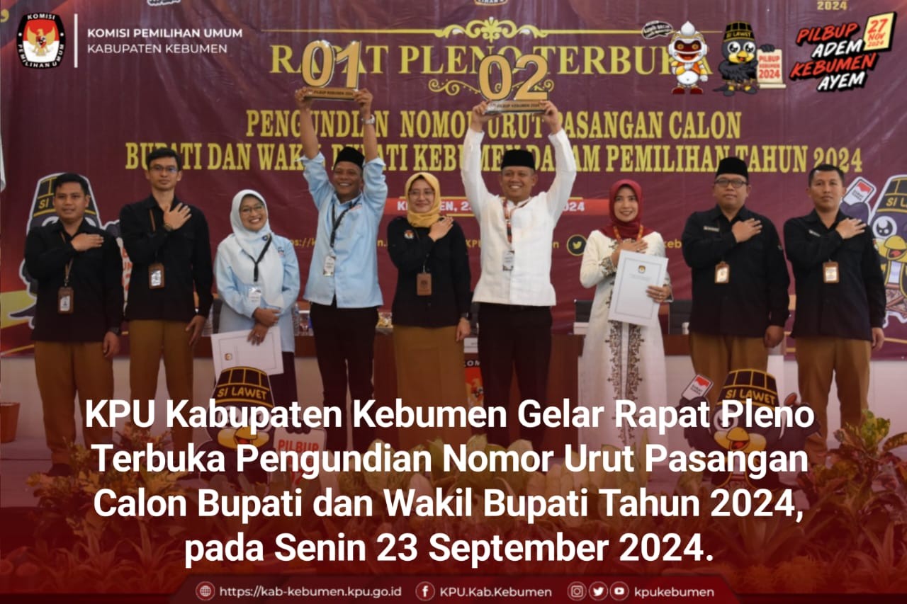 KPU Kabupaten Kebumen menggelar Rapat Pleno Terbuka Pengundian Nomor Urut Pasangan Calon Bupati dan Wakil Bupati Kebumen Tahun 2024 di Hotel Mexolie, Kebumen. Acara yang berlangsung pada Senin 23 September 2024 ini dihadiri oleh ketua dan seluruh anggota KPU Kabupaten Kebumen serta jajaran sekretariat. Turut hadir perwakilan dari Forkopimda Kebumen, Bawaslu Kebumen, Pemantau Pemilihan, serta sejumlah awak media.