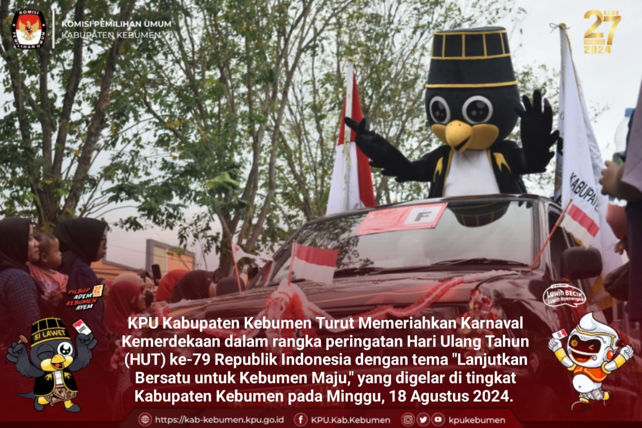 KPU Kabupaten Kebumen turut memeriahkan Karnaval Kemerdekaan dalam rangka peringatan Hari Ulang Tahun (HUT) ke-79 Republik Indonesia dengan tema "Lanjutkan Bersatu untuk Kebumen Maju," yang digelar di tingkat Kabupaten Kebumen pada Minggu, 18 Agustus 2024. KPU Kabupaten Kebumen hadir dengan dua mobil yang dihias dengan indah. Mobil pertama membawa Bendera Merah Putih dan membawa maskot kebanggaan KPU Kabupaten Kebumen, yaitu Si Lawet. Maskot ini menambah keceriaan karnaval dengan tampilannya yang unik dan menarik perhatian masyarakat. Diiringi oleh pemutaran jingle Pilkada Jawa Tengah 2024, mobil ini membawa pesan yang kuat tentang pentingnya partisipasi masyarakat dalam Pilkada. Jingle Pilkada tersebut disertai dengan penjelasan filosofi yang terkandung di dalamnya, mengajak masyarakat untuk bersatu dan berperan aktif dalam memilih pemimpin yang terbaik untuk Jawa Tengah. Mobil pertama yang dilengkapi sound system ini, juga digunakan untuk berorasi mengajak masyarakat untuk aktif berpartisipasi dalam Pilkada Serentak 2024 di Kabupaten Kebumen. Mobil kedua KPU Kabupaten Kebumen dihias menyerupai logo Si Lawet serta dimeriahkan dengan ornament merah putih dilengkapi logo dan ucapan Dirgahayu Republik Indonesia ke -79. Mobil ini membawa tim karnaval yang tampil dalam balutan pakaian adat daerah. Tim ini berperan sebagai Kelompok Penyelenggara Pemungutan Suara (KPPS), beserta sepasang Duta Pilkada 2024 yang turut serta di dalamnya. Tidak lupa, tim juga membawa papan ajakan untuk aktif berpartisipasi dalam pilkada 2024 di Kabupaten Kebumen dan jangan sampai golput. Penampilan mereka menambah semarak karnaval sekaligus mengingatkan masyarakat akan pentingnya menjaga budaya dan kearifan lokal dalam proses demokrasi. Selama berlangsungnya karnaval, KPU Kabupaten Kebumen juga aktif membagikan leaflet kepada masyarakat yang hadir. Leaflet ini berisi informasi lengkap tentang tahapan Pilkada 2024 dan ajakan kepada masyarakat untuk menggunakan hak pilih mereka pada Rabu, 27 November 2024 mendatang. Upaya ini diharapkan dapat meningkatkan kesadaran masyarakat akan pentingnya berpartisipasi dalam Pilkada. Dalam kesempatan yang sama, Ketua Divisi Sosialisasi Pendidikan Pemilih, Partisipasi Masyarakat dan SDM KPU Kabupaten Kebumen, Muhamad Sobir hadir selaku tamu undangan di panggung kehormatan. Hal ini turut menunjukkan komitmen KPU untuk terus mendorong partisipasi aktif masyarakat dalam pemilihan, serta memastikan bahwa proses demokrasi berjalan lancar dan sukses di Kabupaten Kebumen.