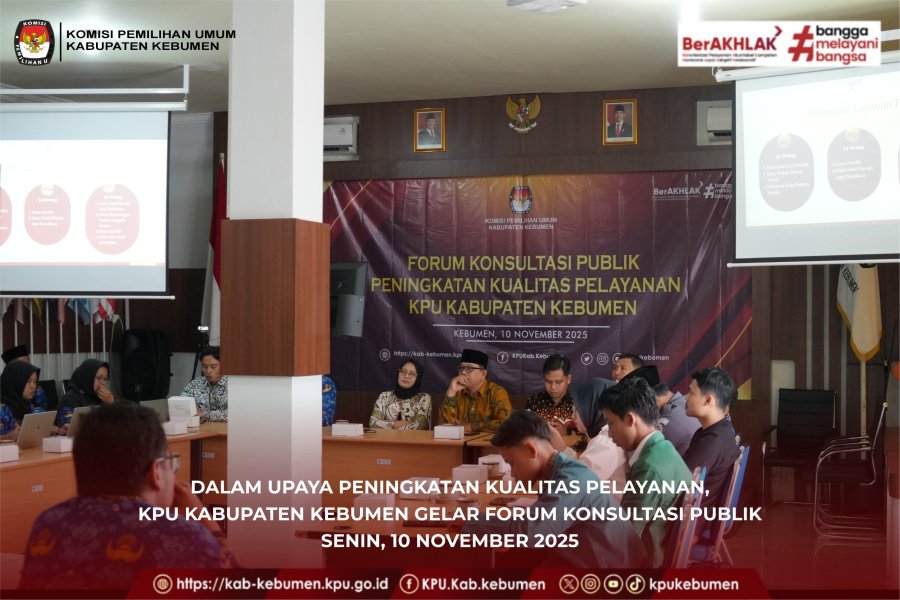 Komisi Pemilihan Umum (KPU) Kabupaten Kebumen menyelenggarakan Forum Konsultasi Publik (FKP) Peningkatan Kualitas Pelayanan di Kantor KPU Kabupaten Kebumen. Kegiatan ini merupakan implementasi dari Permenpan RB Nomor 16 Tahun 2017 tentang Pedoman Penyelenggaraan Forum Konsultasi Publik, sebagai wadah dialog antara penyelenggara layanan publik dan masyarakat pengguna layanan. Turut hadir dalam acara tersebut, Ketua dan Anggota KPU Kabupaten Kebumen beserta Sekretaris dan jajaran sekretariat KPU Kabupaten Kebumen. Acara dibuka oleh Ketua KPU Kabupaten Kebumen, Dzakiatul Banat, yang menegaskan pentingnya forum ini sebagai sarana evaluasi dan refleksi untuk meningkatkan kualitas layanan KPU kepada masyarakat. “Kami berharap forum ini menjadi ruang partisipatif yang konstruktif, tempat kritik dan saran membangun untuk mewujudkan KPU yang lebih transparan, akuntabel, dan responsif,” ujarnya. Kegiatan yang dimoderatori oleh Hajjah Noor Rahmah ini dihadiri oleh berbagai unsur, antara lain Bawaslu Kabupaten Kebumen, Badan Kesbangpol, Persatuan Wartawan Indonesia (PWI), Perisai Demokrasi Bangsa, serta perwakilan dari berbagai perguruan tinggi di Kebumen. Dalam forum tersebut, Sekretaris KPU Kabupaten Kebumen, Subrantas Adhy Candra, menekankan peran Pejabat Pengelola Informasi dan Dokumentasi (PPID) sebagai jembatan antara KPU dan publik dalam penyediaan informasi yang transparan. Ia juga mengakui perlunya peningkatan kompetensi SDM, penyederhanaan alur layanan, dan perluasan sosialisasi publik agar akses informasi lebih optimal. Berbagai pihak memberikan masukan, mulai dari peningkatan sarana prasarana layanan publik, optimalisasi website resmi KPU, hingga pentingnya sosialisasi berkelanjutan kepada mahasiswa dan masyarakat. Forum ini ditutup dengan komitmen bersama untuk menjadikan FKP bukan sekadar kewajiban administratif, melainkan kebutuhan bersama dalam membangun layanan publik yang dipercaya masyarakat. KPU Kabupaten Kebumen bertekad untuk terus memperkuat keterbukaan informasi, partisipasi masyarakat, dan akuntabilitas penyelenggaraan pemilu menuju pelayanan publik yang unggul dan berintegritas.