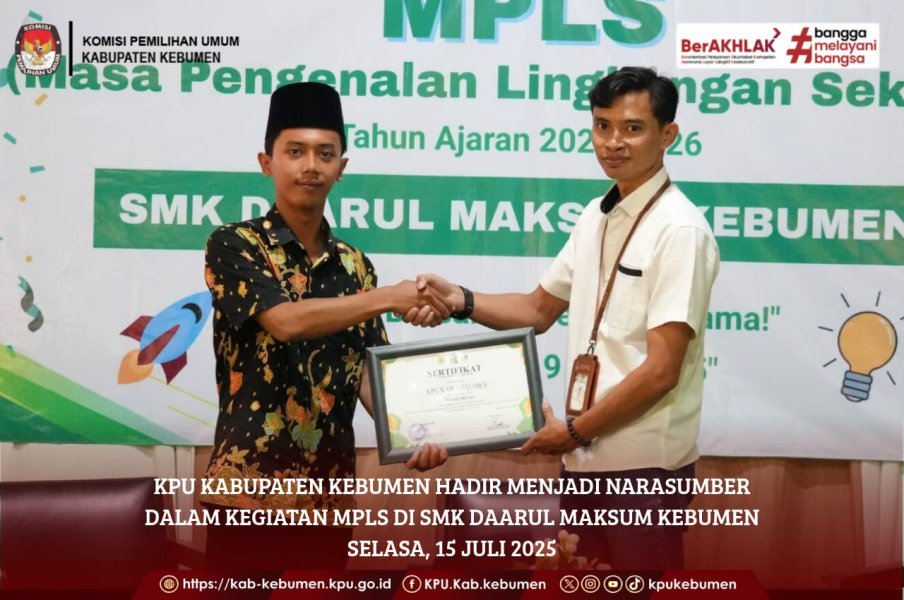 Anggota Komisi Pemilihan Umum (KPU) Kabupaten Kebumen, Bapak Heri Purnama, S.Pd, hadir sebagai narasumber dalam kegiatan Masa Pengenalan Lingkungan Sekolah (MPLS) di SMK Daarul Maksum Kebumen, Selasa (15/7). Mengusung tema “Tumbuh Bersama, Hebat Bersama”, kegiatan ini tidak hanya diikuti oleh para siswa baru, namun juga melibatkan siswa kelas XI. Dalam kesempatan tersebut, Bapak Heri Purnama menyampaikan materi mengenai pentingnya demokrasi, peran serta pemilih, serta keterlibatan generasi muda dalam proses demokrasi di Indonesia. Ia menekankan bahwa generasi muda memiliki posisi strategis sebagai agen perubahan dan masa depan bangsa, sehingga perlu dibekali dengan pemahaman tentang sistem demokrasi dan pentingnya menjadi pemilih yang cerdas dan bertanggung jawab. Kegiatan ini berlangsung dengan antusiasme tinggi dari para peserta, yang aktif berdiskusi dan bertanya seputar isu-isu kepemiluan. Dengan diadakannya sesi seperti ini, diharapkan siswa-siswi SMK Daarul Maksum dapat lebih memahami hak dan tanggung jawab mereka sebagai warga negara sejak dini dan sebagai bentuk apresiasi KPU Kabupaten Kebumen juga memberi dooprize kepada siswa-siswi yang berani untuk bertanya maupun menjawab pertanyaa.