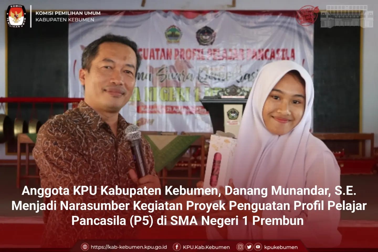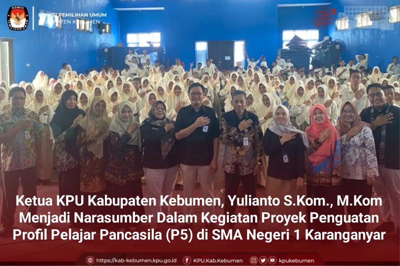 Prembun– Anggota KPU Kabupaten Kebumen, Danang Munandar, S.E. menjadi Narasumber dalam kegiatan Proyek Penguatan Profil Pelajar Pancasila (P5) yang diselenggarakan di SMA Negeri 1 Prembun Kebumen, Senin (21/08/2023). Kegiatan yang diikuti oleh seluruh siswa-siswi SMA Negeri 1 Prembun tersebut, merupakan upaya untuk mendorong pemahaman yang lebih mendalam tentang demokrasi dan pentingnya pemilu dalam mewujudkan nilai-nilai Pancasila dalam kehidupan berbangsa dan bernegara. Dalam pembukaan acara, Kepala Sekolah SMA Negeri 1 Prembun, Bapak Waluyo Widodo, S.Pd., M.M. mengharapkan kegiatan tersebut dapat meningkatkan pemahaman siswa-siswi tentang demokrasi, nilai-nilai Pancasila, dan pentingnya peran pemilu dalam membangun bangsa yang lebih baik. Kemudian, Anggota KPU Kabupaten Kebumen, Bapak Danang Munandar, S.E., menyampaikan konsep demokrasi dan pemilu. Beliau menjelaskan bahwa demokrasi adalah salah satu bentuk nyata dari nilai-nilai Pancasila, di mana rakyat memiliki hak untuk ikut serta dalam mengambil keputusan yang berkaitan dengan pemerintahan dan kepemimpinan negara. Adapun Pemilu merupakan kesempatan bagi rakyat untuk memilih pemimpin dan wakil rakyat dalam pemerintahan dan mengambil peran aktif dalam menentukan arah negara. Beliau juga menjelaskan sejarah awal demokrasi dan pemilu di Indonesia, serta unsur-unsur utama pemilu ”Pemilu terdiri dari 3 unsur, yaitu peserta pemilu, penyelenggara pemilu dan pemilih. Sebagai generasi muda, jadilah pemilih pemula yang cerdas agar pemilu dapat berlangsung dengan lancar sehingga menghasilkan wakil rakyat dan pemimpin yang baik bagi bangsa dan negara”, pungkasnya. Kegiatan dilanjutkan dengan sesi tanya jawab yang diikuti dengan antusias oleh para siswa dan siswi dan ditutup dengan orasi dari para Calon Ketua Osis SMA Negeri 1 Prembun. Selepas kegiatan tersebut, Bapak Danang Munandar, S.E turut berpartisipasi dalam sesi wawancara dengan jurnalis sekolah di SMA Negeri 1 Prembun. Dalam wawancara tersebut, beliau mengajak para pelajar untuk memahami nilai-nilai demokrasi sejak dini, agar generasi muda dapat menjadi warga negara yang bertanggung jawab dan berperan aktif dalam membangun Indonesia yang lebih baik.
