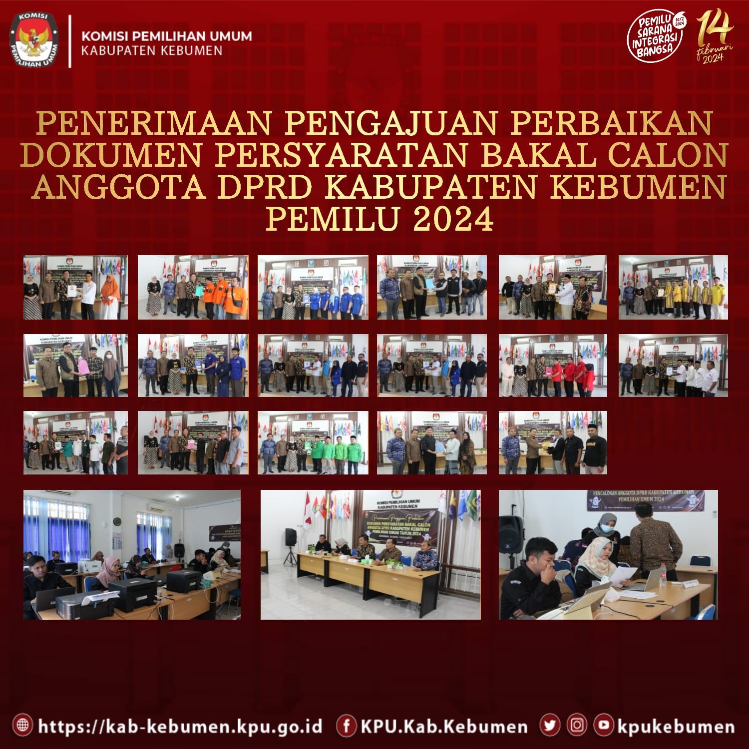 KPU Kebumen-Sebanyak 17 partai politik peserta pemilu ajukan perbaikan dokumen persyaratan Bakal Calon Anggota DPRD Kabupaten Kebumen untuk Pemilu 2024, Minggu (09/07/2023), di Kantor KPU Kebumen, Jl. Arungbinang 14 Kebumen. Sesuai jadwal dan tahapan pencalonan, masa perbaikan dokumen persyaratan bakal calon dimulai tanggal 26 Juni hingga 9 Juli 2023. Hingga akhir masa perbaikan, dari 18 partai politik yang melakukan pengajuan awal ada 17 partai politik yang melakukan perbaikan dokumen yaitu, Partai Keadilan Sejahtera (PKS), Partai Demokrasi Indonesia Perjuangan (PDI Perjuangan), Partai Persatuan Pembangunan (PPP), Partai Demokrat, Partai Buruh, Partai Golongan Karya (Golkar), Partai Kebangkitan Bangsa (PKB), Partai Kebangkitan Nusantara (PKN), Partai Amanat Nasional (PAN), Partai Gerakan Indonesia Raya (Gerindra), Partai Persatuan Indonesia (Perindo), Partai Nasional Demokrat (NasDem), Partai Ummat, Partai Solidaritas Indonesia (PSI), Partai Bulan Bintang (PBB), Partai Hati Nurani Rakyat (Hanura) dan Partai Gelombang Rakyat (Gelora). Perbaikan dokumen yang dapat dilakukan oleh partai politik meliputi pemenuhan dokumen persyaratan bakal calon yang dinyatakan belum memenuhi syarat pada saat verifikasi administrasi awal, penggantian daerah pemilihan, pengubahan nomor urut bakal calon maupun penggantian bakal calon dengan calon baru. Pengajuan dilakukan oleh Ketua dan Tim Parpol dan diterima langsung oleh Ketua KPU Kebumen, Yulianto, S.Kom, M.Kom didampingi Anggota KPU Kebumen Danang Munandar, SE, Agus Hasan Hidayat, S.Si, MT, Dzakiatul Banat, dan Solahudin, ST. Selanjutnya dilakukan verifikasi dokumen perbaikan oleh Tim Verifikasi KPU Kebumen. Setelah dokumen pengajuan perbaikan dinyatakan lengkap dan benar maka pengajuan dinyatakan diterima. Tahapan selanjutnya adalah verifikasi administrasi perbaikan yang akan dilaksanakan mulai 10 Juli hingga 6 Agustus 2023.
