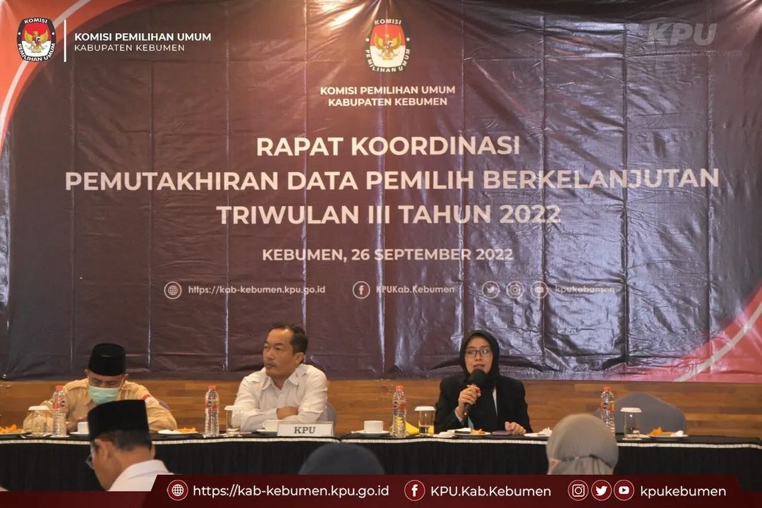 Kebumen – KPU Kebumen menggelar Rapat Koordinasi Pemutakhiran Data Pemilih Berkelanjutan (DPB) Triwulan III Tahun 2022, Senin (26/09), bertempat di Hotel Grand Kolopaking Kebumen. Dihadiri oleh Bawaslu, Disdukcapil, Polres, Kodim 0709, dan perwakilan Partai Politik se-Kabupaten Kebumen serta rekan media. Anggota KPU Kabupaten Kebumen, Bapak Danang Munandar, SE, membuka acara Rapat Koordinasi Pemutakhiran Data Pemilih Berkelanjutan Triwulan III Tahun 2022 yang kemudian dilanjutkan dengan paparan dari Anggota KPU Kebumen Divisi Perencanaan, Data dan Informasi, Dzakiatul Banat, terkait hasil Rekapitulasi Data Pemilih Berkelanjutan Periode September 2022. Dalam paparannya Banat menyampaikan KPU Kabupaten Kebumen mendapat massukan data dari TNI dan Polri sampai dengan bulan Agustus 2022, data siswa pemilih pemula dari Kementerian Agama Kabupaten Kebumen dan data dari KPU RI hasil pemadanan dengan Kementerian Dalam Negeri dan Badan Pusat Statistika. Terkait dengan hal tersebut maka terdapat perubahan pemilih dari DPB pada bulan sebelumnya. Perubahan jumlah pemilih ini disebabkan adanya 13.509 pemilih yang Tidak Memenuhi Syarat, 27.185 pemilih baru dan 18 pemilih melakukan perbaikan data pemilih. Sehingga DPB Kabupaten Kebumen di akhir Triwulan III Tahun 2022 (Bulan September) sejumlah 1.047.684 pemilih dengan rincian pemilih laki-laki berjumlah 527.466 pemilih dan pemilih perempuan berjumlah 520.218 pemilih.