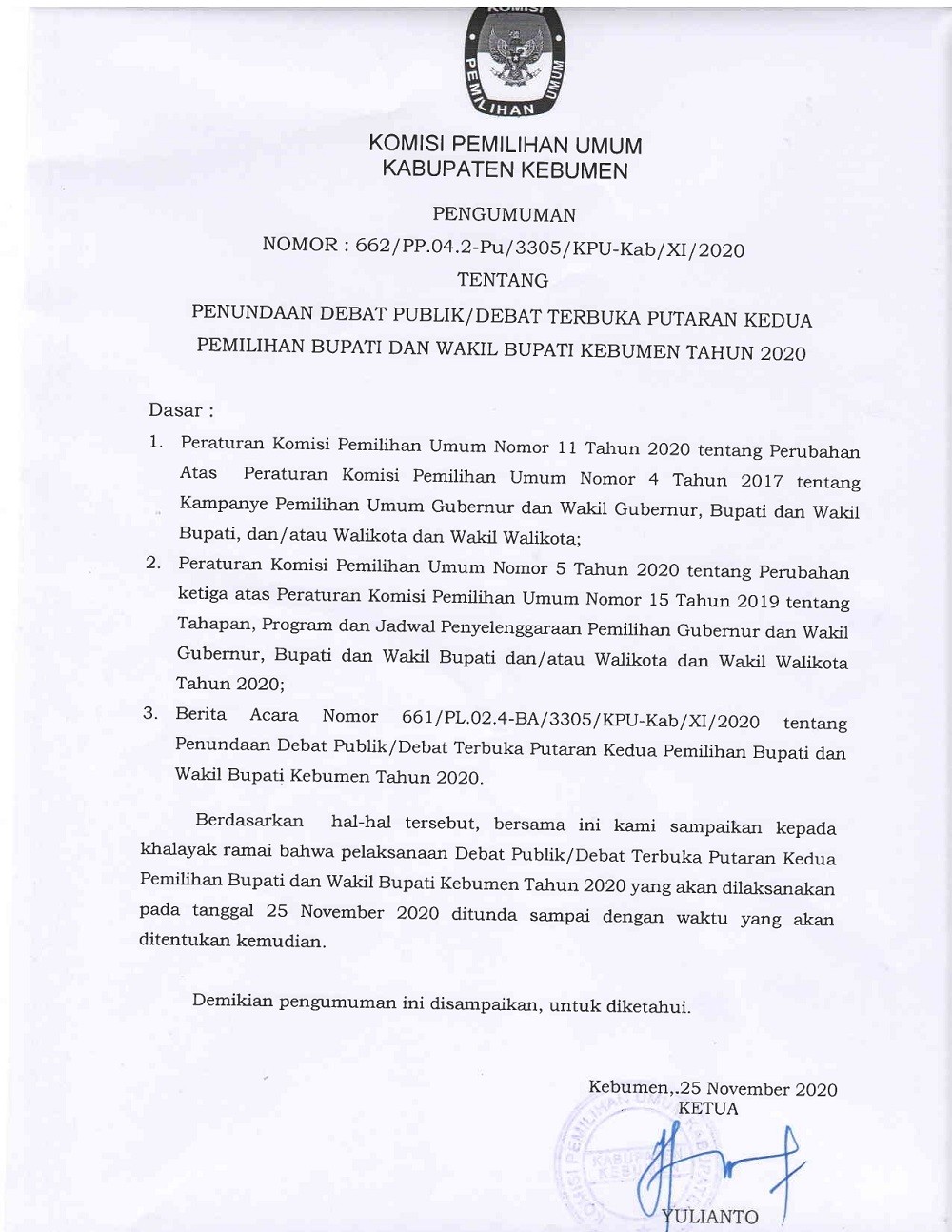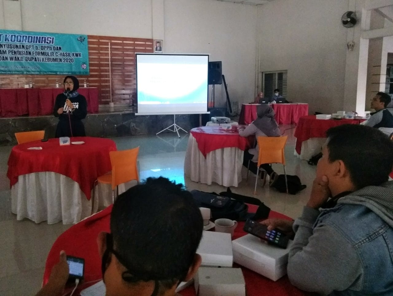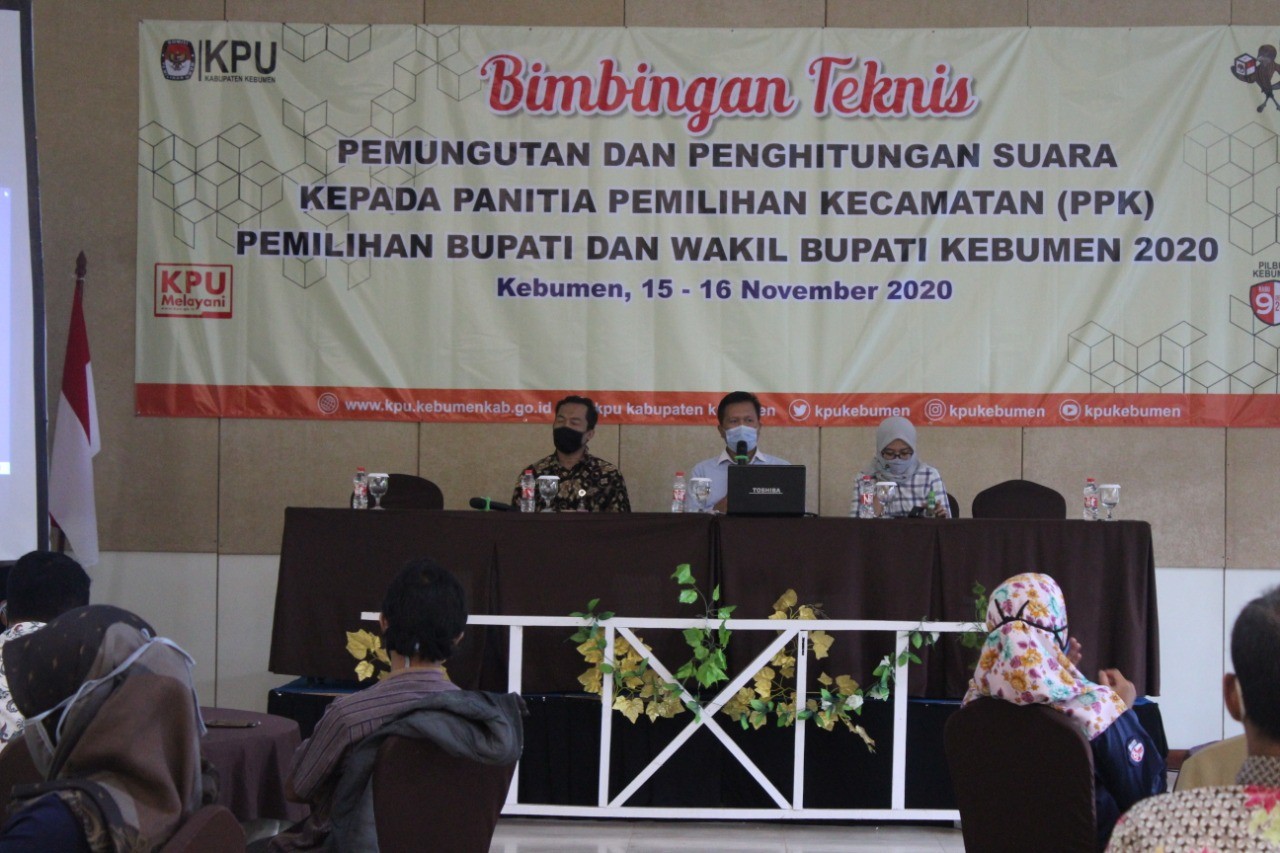 Kebumen - KPU Kebumen gelar Rapat Koordinasi Persiapan Penyusunan DPTb, DPPh, dan pemanfaatan DPT dalam pengisian Formulir C- Hasil KWK dalam Pemilihan Bupati dan Wakil Bupati Kebumen 2020, Minggu(22/11), di RM Yunani, Sruweng. Peserta kegiatan adalah Anggota PPK divisi Data dan Informasi dari 26 Kecamatan se Kabupaten Kebumen. Anggota KPU Kebumen Divisi Perencanaan, Data dan Informasi, Dzakiatul Banat, SE, M.Pd yang memandu langsung kegiatan tersebut mengatakan bahwa tujuan rapat koordinasi ini adalah untuk menginventarisir titik-titik TPS yang melayani Rumah Sakit/Puskesmas Rawat Inap/Panti. “ PPK yang di wilayah kerjanya ada Rumah Sakit/Puskesmas Rawat Inap/panti harus melakukan koordinasi untuk meminta data pemilih yang berpotensi menjadi pemilih pindahan”, ujarnya. Lebih lanjut Dzakiatul Banat menerangkan, potensi pemilih pindahan tersebut meliputi karyawan yang terjadwal sedang bertugas pada tanggal 9 Desember sehingga tidak bisa memilih di TPS asalnya, pasien yang sekiranya masih menjalani rawat inap pada hari pencoblosan, dan keluarga yang mendampingi pasien rawat inap. Data tersebut diminta selambat-lambatnya H-1 untuk dibuatkan formulir pindah pemilih (A5 – KWK) oleh PPS setempat.
