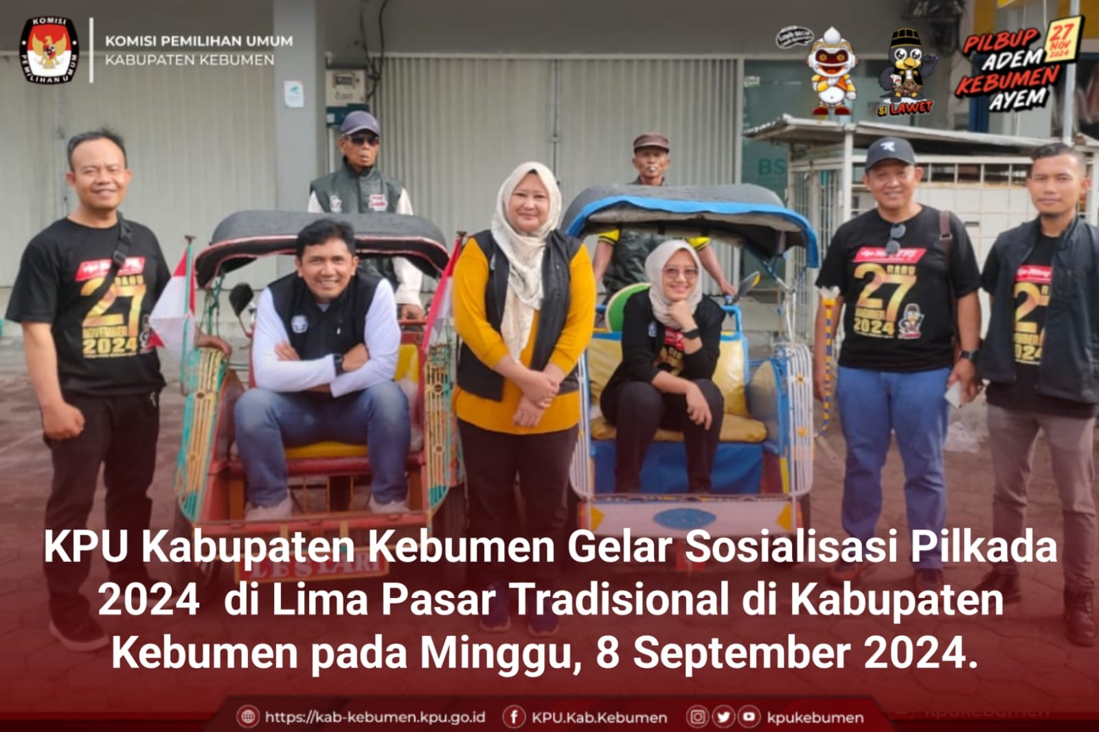KPU Kabupaten Kebumen menggelar kegiatan sosialisasi Pilkada 2024 di lima pasar tradisional di Kabupaten Kebumen pada Minggu, 8 September 2024. Kegiatan ini dilaksanakan oleh komisioner KPU Kabupaten Kebumen serta segenap jajaran sekretariat. Ketua KPU Kabupaten Kebumen, Dzakiatul Banat menyatakan bahwa kegiatan ini merupakan bagian dari upaya KPU untuk meningkatkan pengetahuan dan kesadaran masyarakat terkait Pilkada 2024. Adapun pasar-pasar yang menjadi lokasi sosialisasi antara lain Pasar Rakyat Pagi Kebumen, Pasar Kutowinangun, Pasar Prembun, Pasar Karanganyar, dan Pasar Gombong. Kegiatan ini bertujuan untuk memberikan pemahaman kepada masyarakat terkait proses pemilihan Gubernur dan Wakil Gubernur Jawa Tengah, serta Bupati dan Wakil Bupati Kebumen yang akan dilaksanakan pada Rabu 27 November 2024. Dalam sosialisasinya, tim dari KPU Kabupaten Kebumen menginformasikan tentang tahapan dan jadwal pilkada 2024 serta mengajak masyarakat untuk aktif mengecek status daftar pemilih guna memastikan setiap warga yang berhak memilih sudah terdaftar. Masyarakat diperkenalkan dengan cara mudah mengecek daftar pemilih secara online melalui laman resmi KPU di https://cekdptonline.kpu.go.id. Langkah ini diharapkan dapat meningkatkan partisipasi pemilih dan memastikan tidak ada warga yang kehilangan hak pilihnya. Selain memberikan sosialisasi, KPU Kabupaten Kebumen juga membagikan rompi Pilkada 2024 kepada masyarakat di pasar, termasuk pedagang, pembeli, hingga tukang becak. Masyarakat menyambut kegiatan ini dengan antusias, terlihat dari tingginya partisipasi dan perhatian yang diberikan selama sosialisasi berlangsung. Sosialisasi di pasar ini dinilai efektif karena langsung menyasar masyarakat luas di lokasi keramaian. KPU Kabupaten Kebumen berkomitmen untuk terus melakukan sosialisasi secara masif hingga menjelang hari pemilihan, demi meningkatkan partisipasi masyarakat dalam Pilkada 2024.