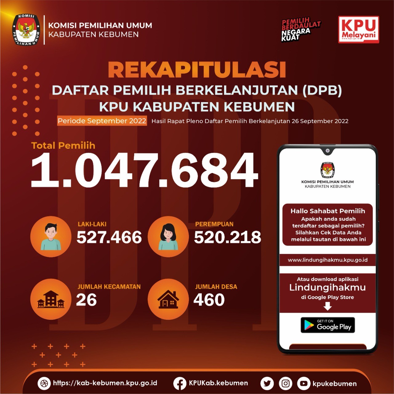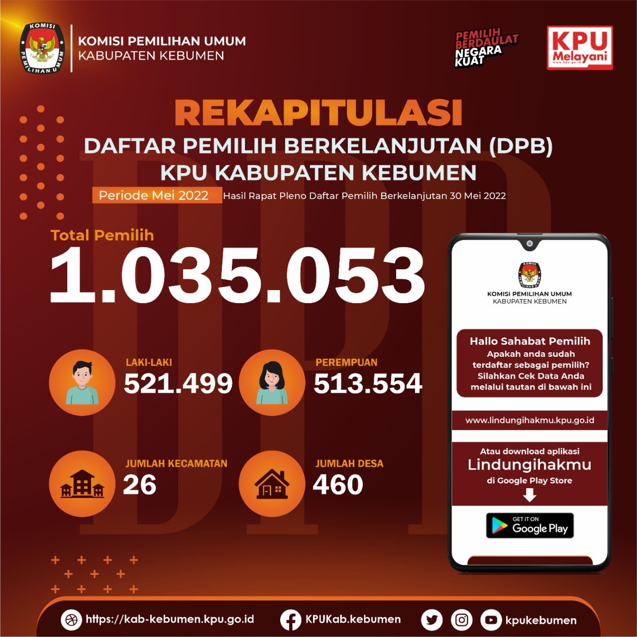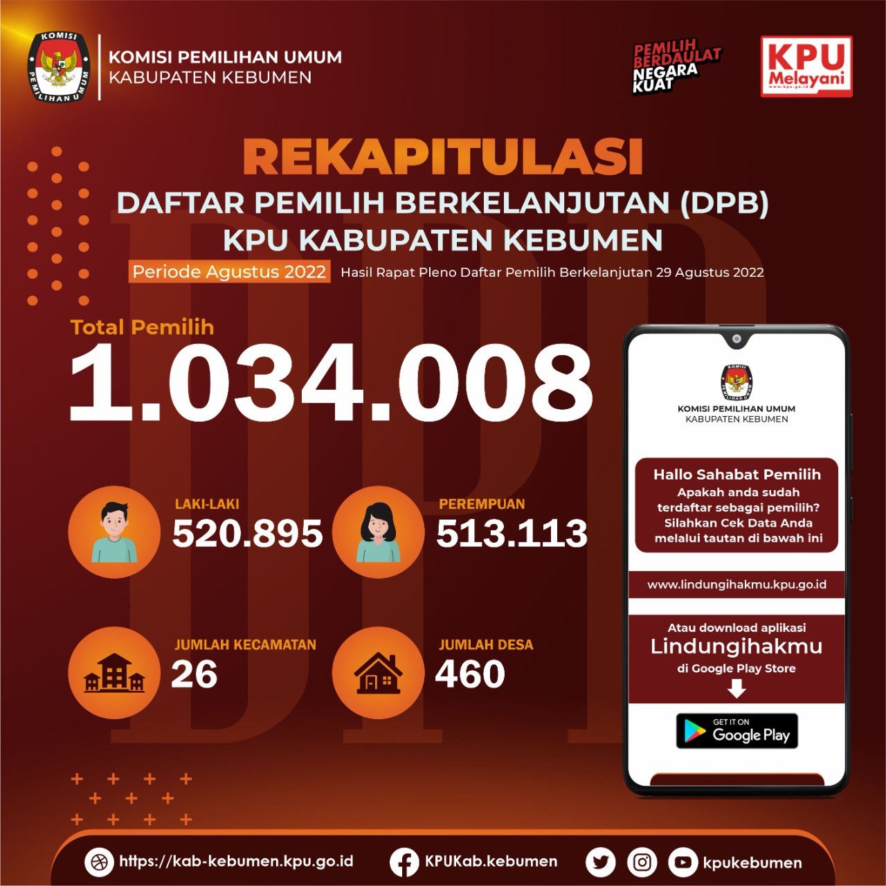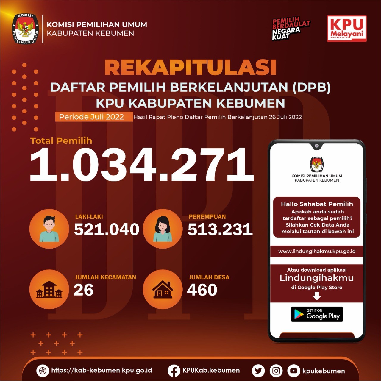 Daftar Pemilih Berkelanjutan Kabupaten Kebumen Bulan Juni 2022 sejumlah 1.034.741 pemilih, Jumlah tersebut ditetapkan melalui Rapat Pleno Internal Daftar Pemilih Berkelanjutan bulan Juni 2022 yang telah dilaksanakan pada Kamis (23/6), di Kantor KPU Kabupaten Kebumen.