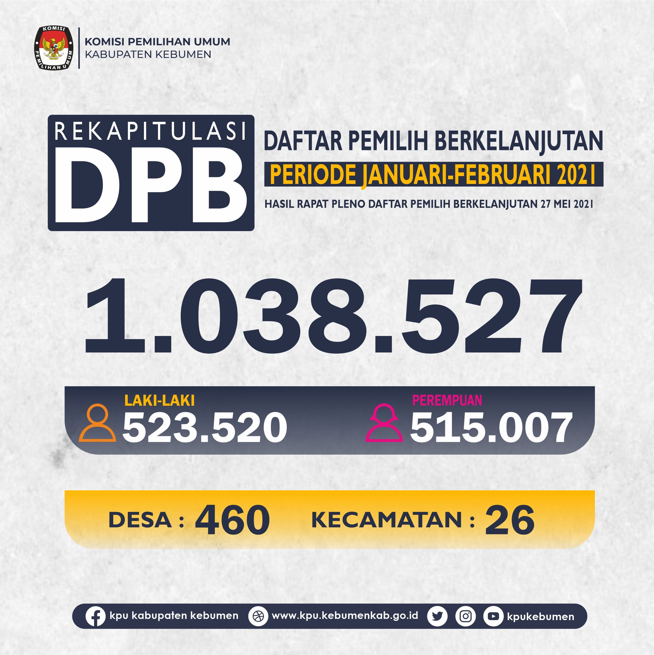 Daftar Pemilih Berkelanjutan Kabupaten Kebumen Bulan Januari-Februari 2021 sejumlah 1.038.527 pemilih. Jumlah tersebut ditetapkan melalui Rapat Pleno Internal Daftar Pemilih Berkelanjutan bulan Januari-Februari 2021 yang telah dilaksanakan pada Senin (8/3), di Kantor KPU Kabupaten Kebumen.