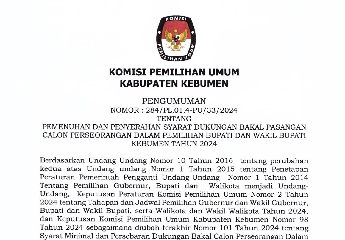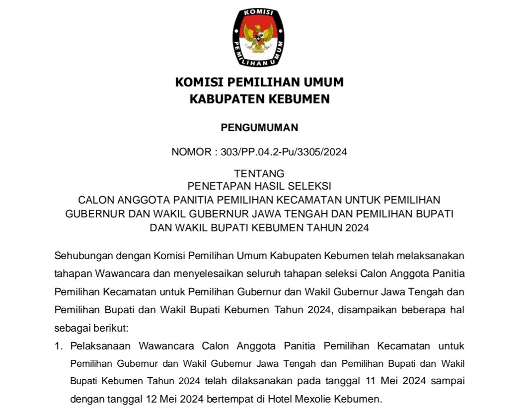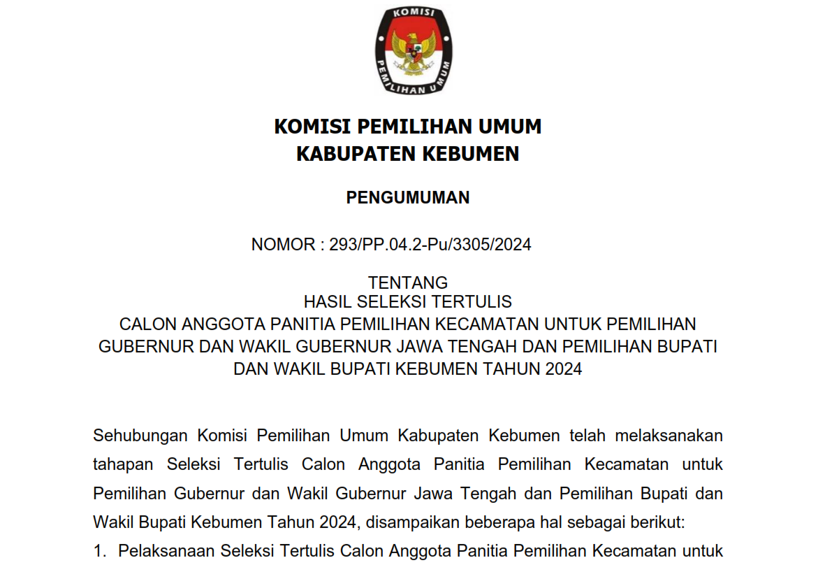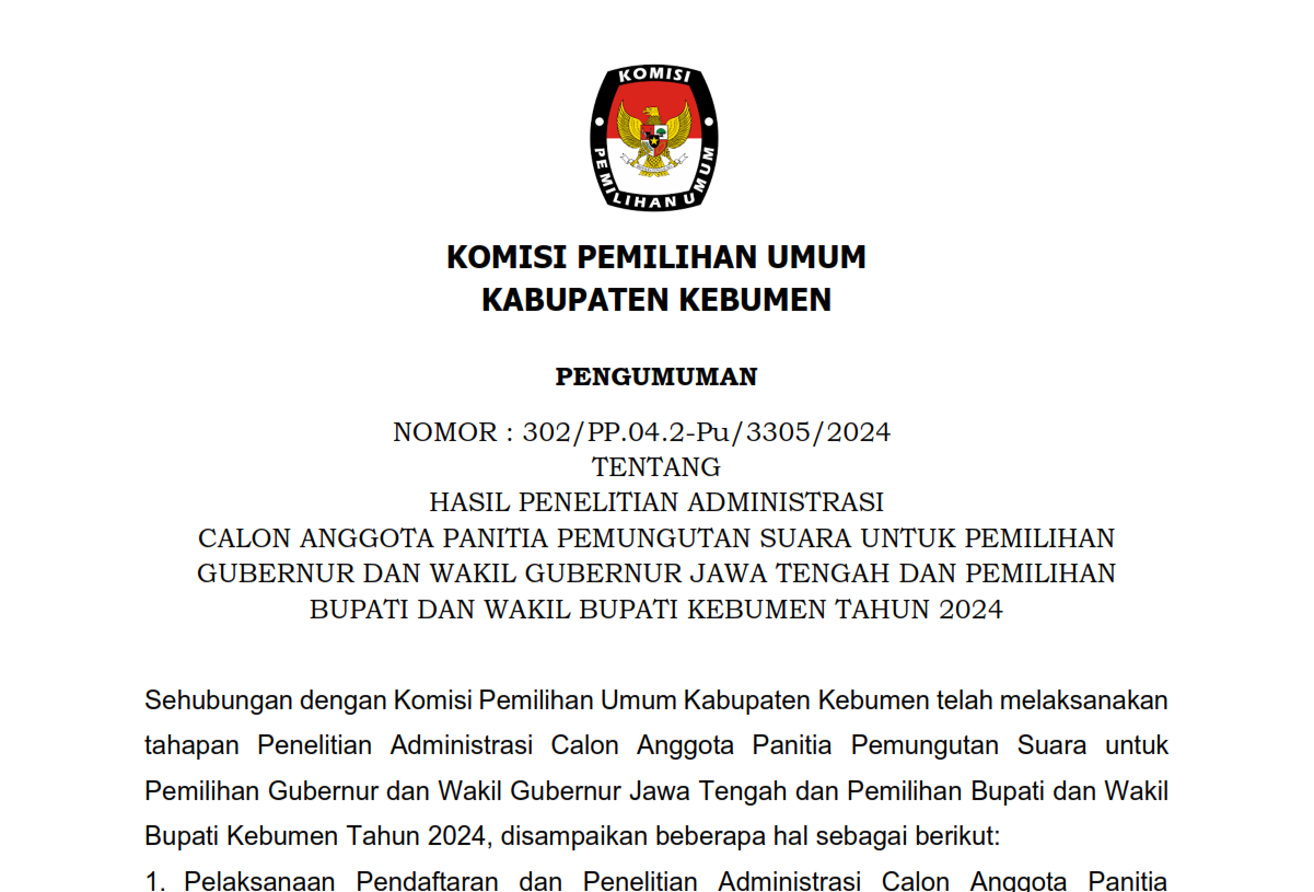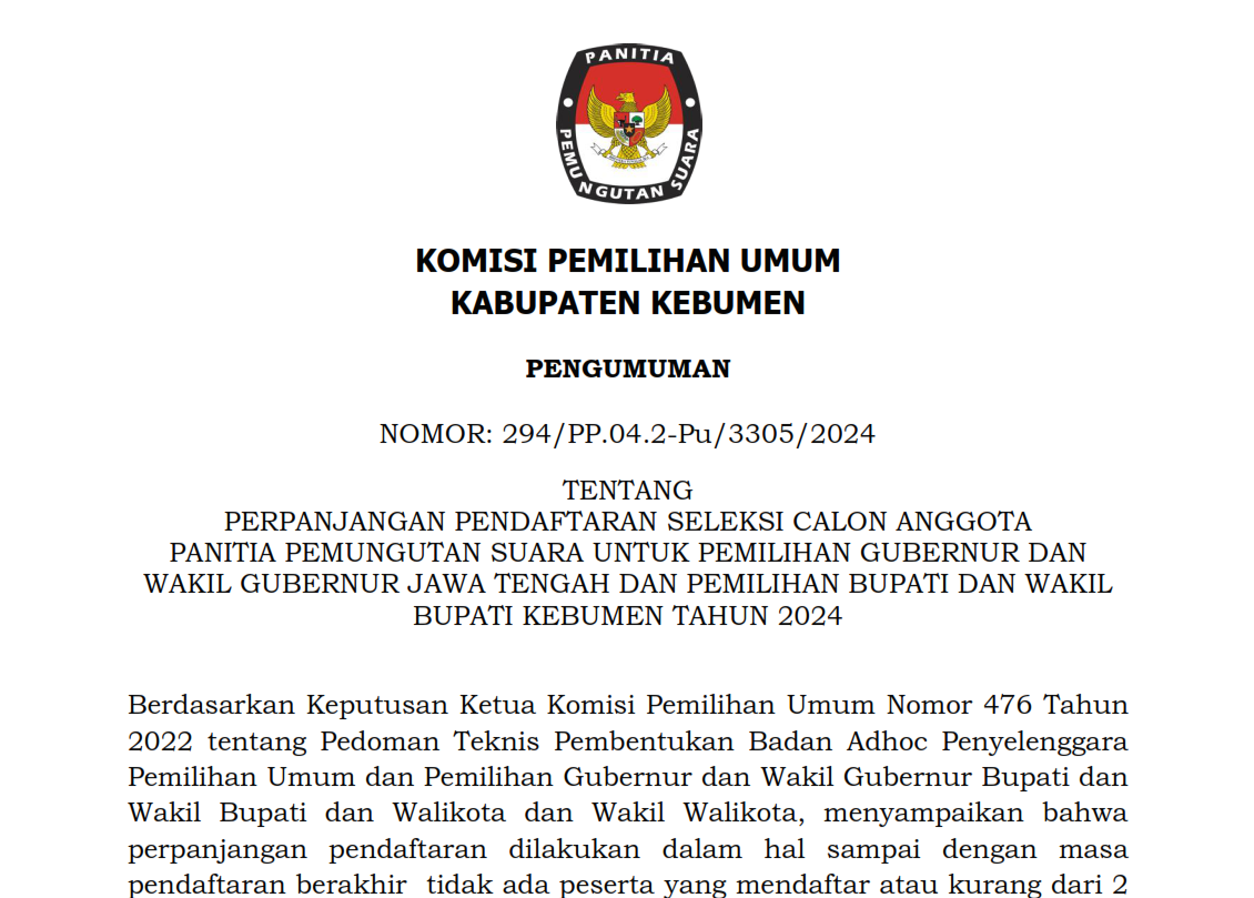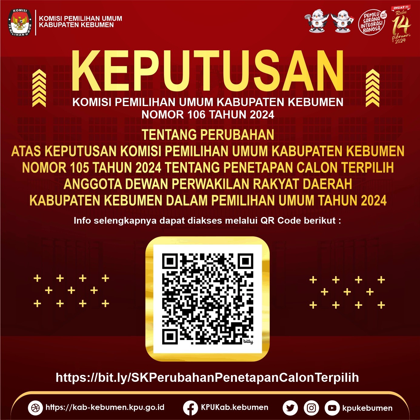 Salinan Keputusan Komisi Pemilihan Umum Kabupaten Kebumen Nomor 106 Tahun 2024 tentang Perubahan atas Keputusan Komisi Pemilihan Umum Kabupaten Kebumen Nomor 105 Tahun 2024 tentang Penetapan Calon Terpilih Anggota Dewan Perwakilan Rakyat Daerah Kabupaten Kebumen dalam Pemilihan Umum Tahun 2024 selengkapnya dapat diunduh DISINI.