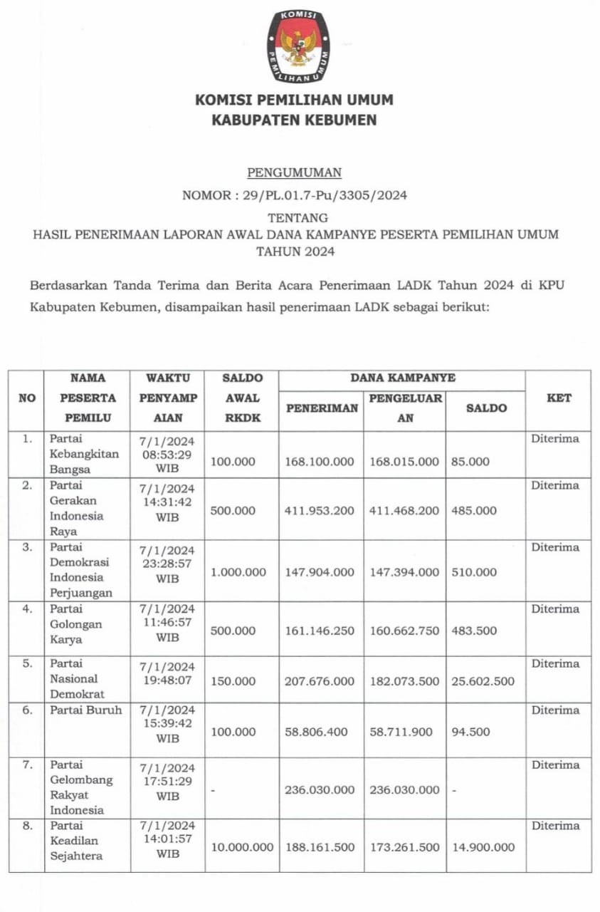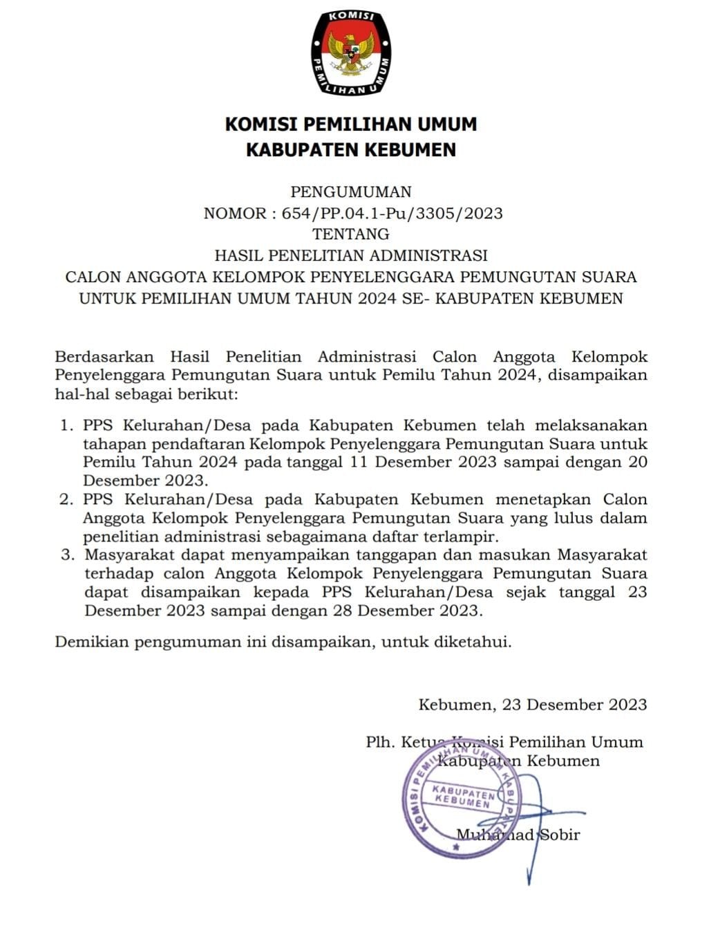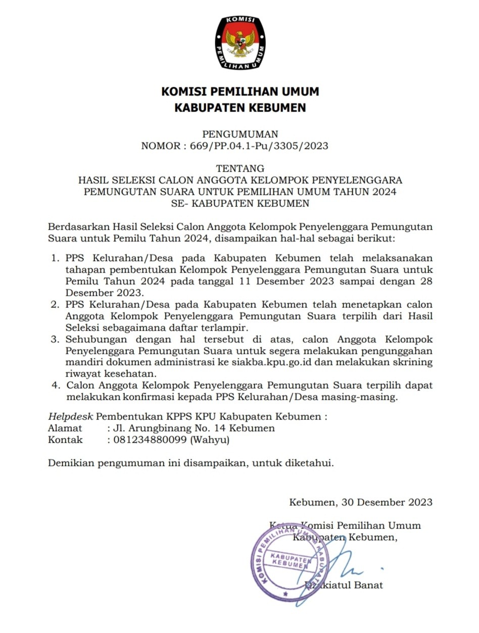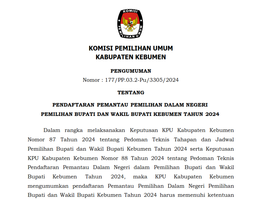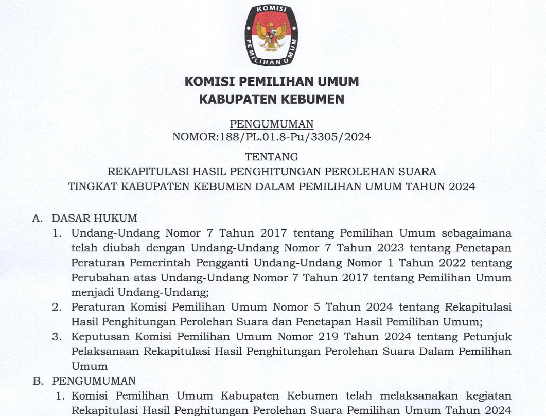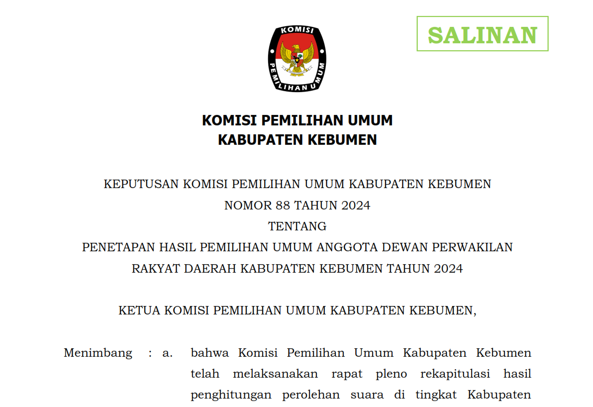 Sehubungan dengan terdapat kekeliruan nama dalam penulisan Hasil Pemilihan Umum Anggota DPRD Kabupaten KebumenTahun 2024 berikut terlampir revisi salinan Keputusan Komisi Pemilihan Umum Kabupaten Kebumen Nomor 88 Tahun 2024 tentang Penetapan Hasil Pemilihan Umum Anggota DPRD Kabupaten KebumenTahun 2024.