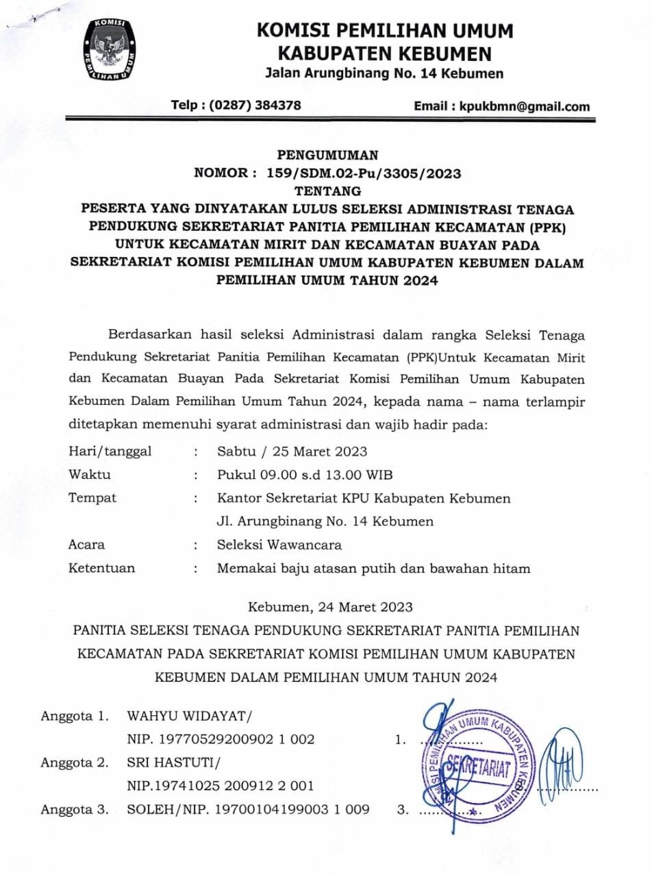 PENGUMUMAN HASIL PENELITIAN ADMINISTRASI BAKAL CALON ANGGOTA KPU KABUPATEN/KOTA PERIODE 2023-2028 WILAYAH JATENG IV dapat diunduh disini