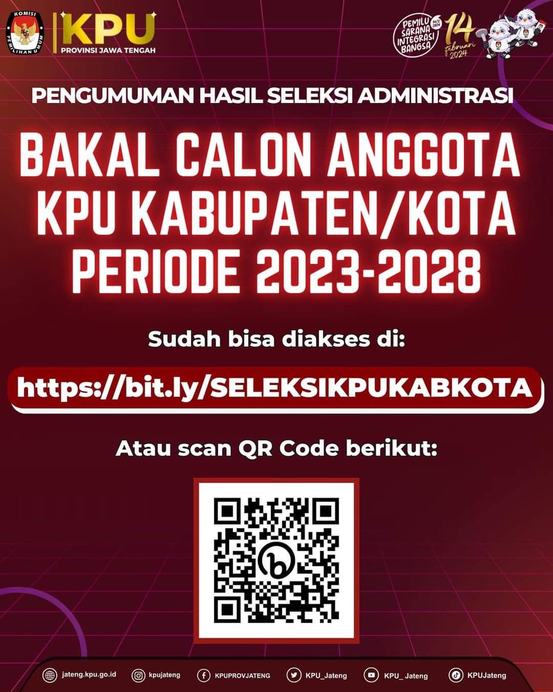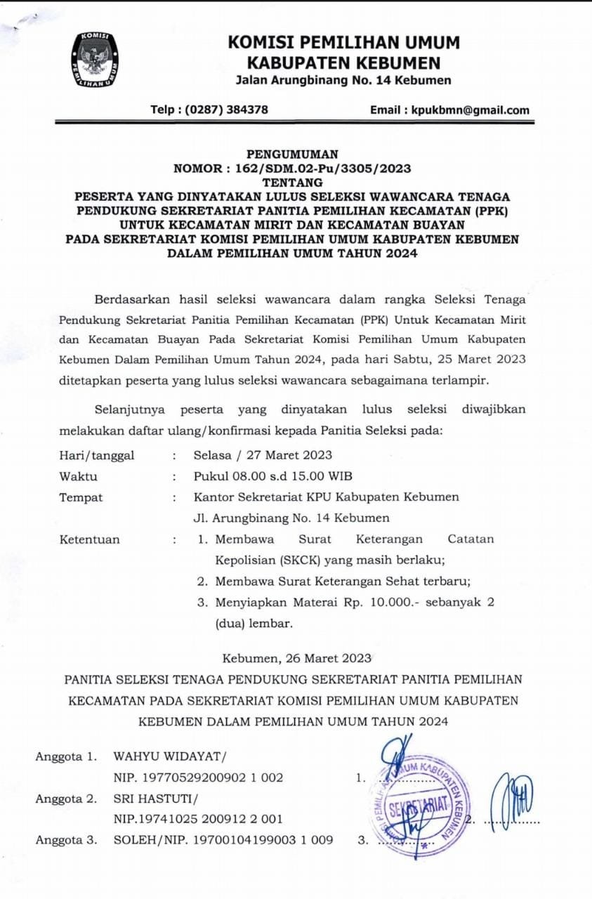 PENGUMUMAN HASIL PENELITIAN ADMINISTRASI BAKAL CALON ANGGOTA KPU KABUPATEN/KOTA PERIODE 2023-2028 WILAYAH JATENG V dapat diunduh disini