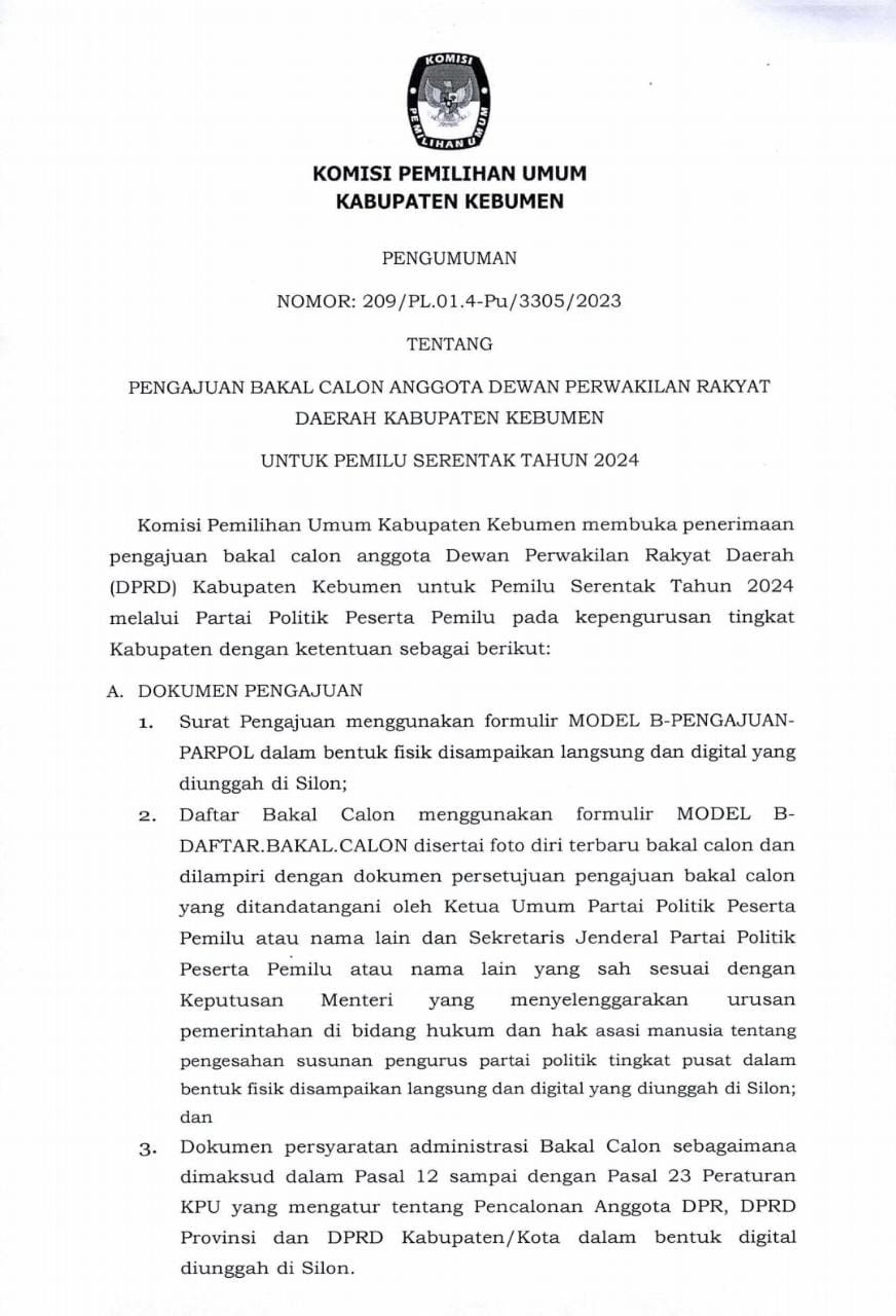 PENGUMUMAN HASIL PENELITIAN ADMINISTRASI BAKAL CALON ANGGOTA KPU KABUPATEN/KOTA PERIODE 2023-2028 WILAYAH JATENG II dapat diunduh disini