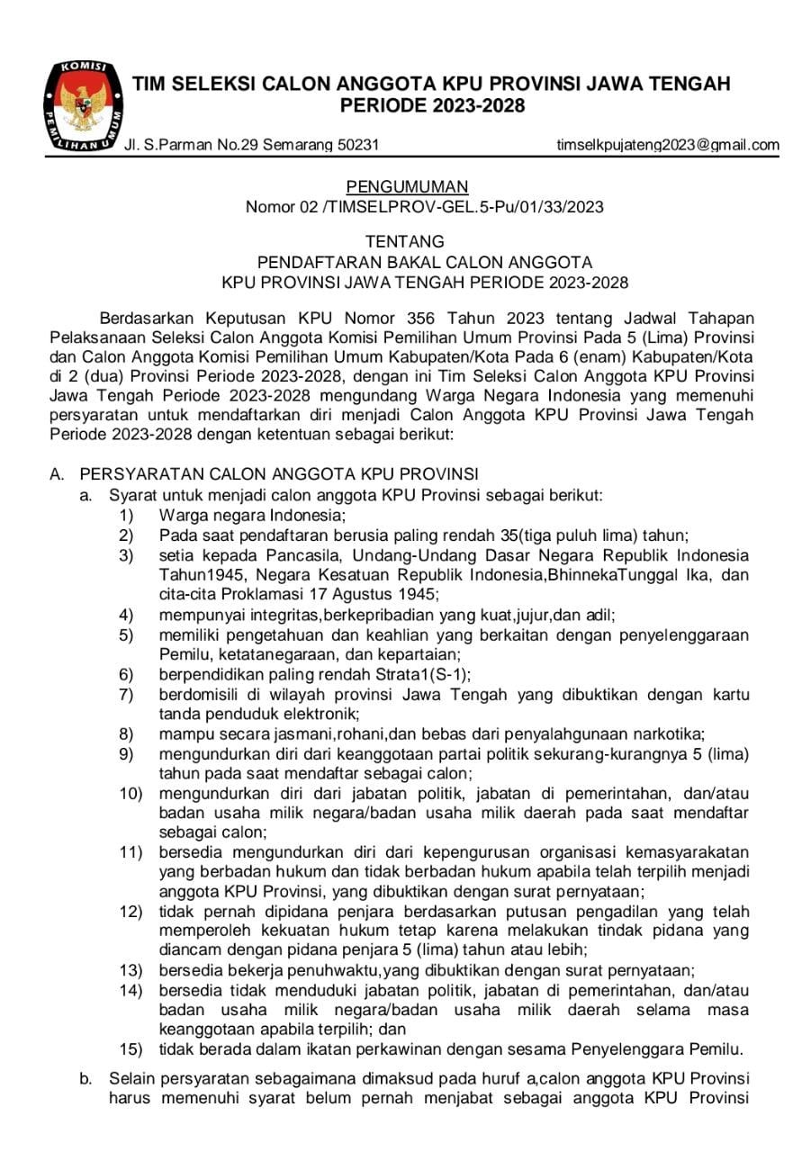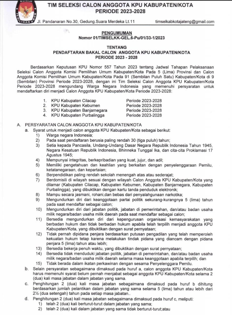 PENGUMUMAN HASIL PENELITIAN ADMINISTRASI BAKAL CALON ANGGOTA KPU KABUPATEN/KOTA PERIODE 2023-2028 WILAYAH JATENG I dapat diunduh disini