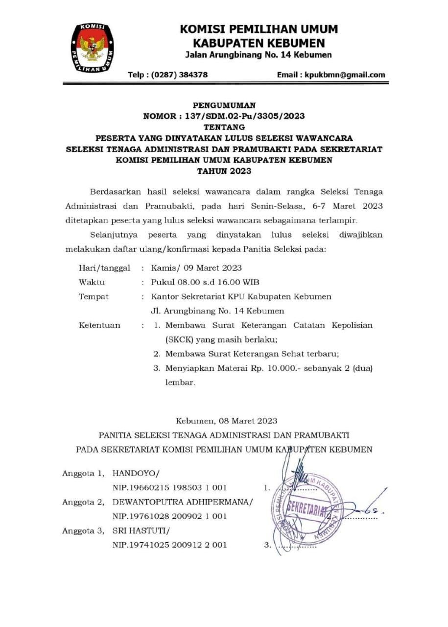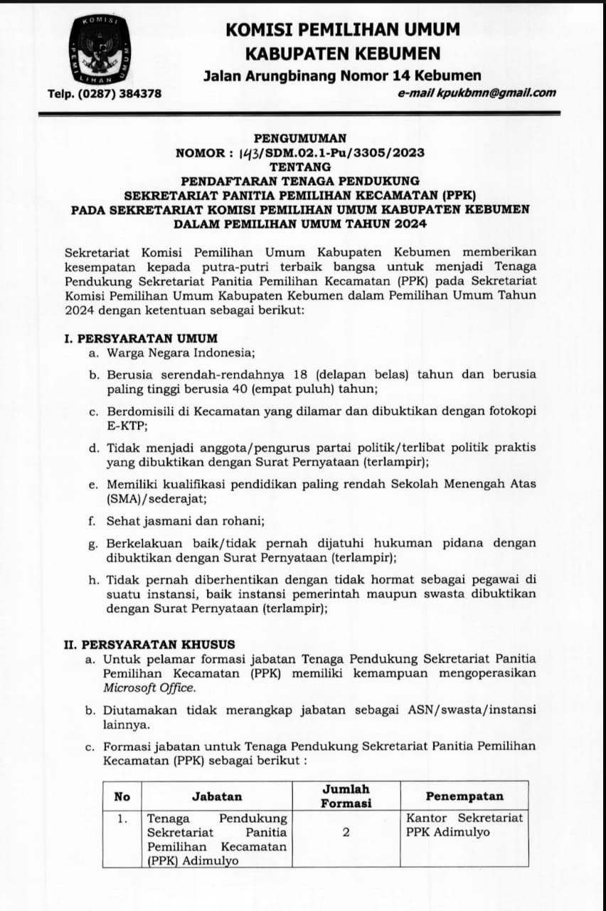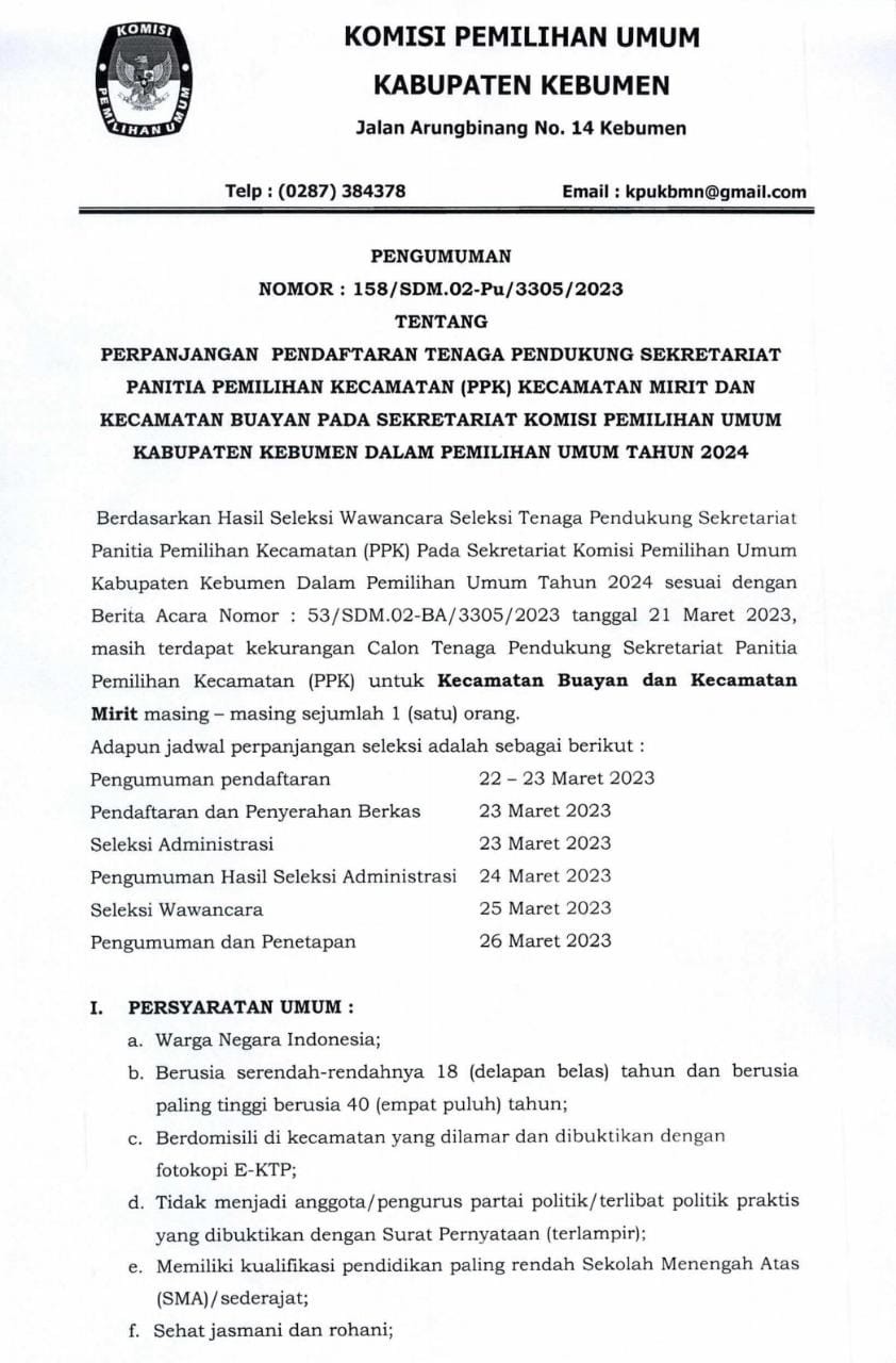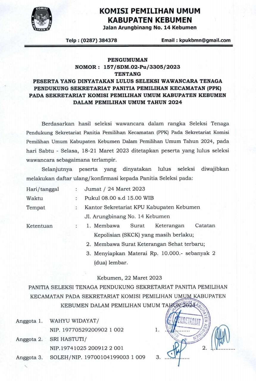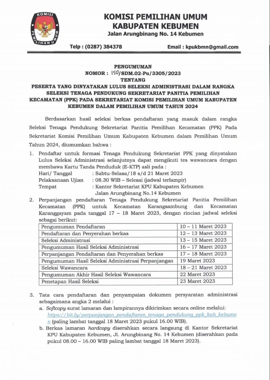 Pengumuman Nomor 150/SDM.02.1-Pu/3305/2023 tentang Peserta yang ditanyakan Lulus Seleksi Administrasi Tenaga Pendukung Sekretariat Panitia Pemilihan Kecamatan (PPK) Pada Sekretariat KPU Kabupaten Kebumen dalam Pemilihan Umum Tahun 2024 dan Perpanjangan Pendaftaran untuk Kecamatan Karangsambung dan Karanggayam.