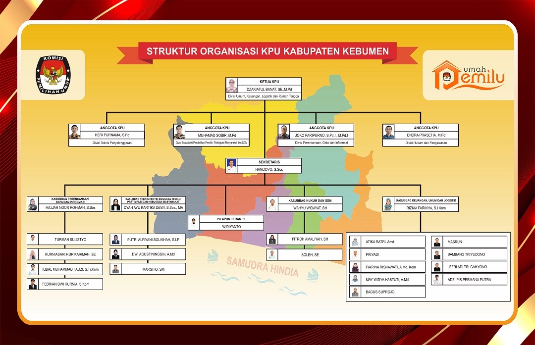 Saat ini KPU Kabupaten Kebumen mempunyai 25 pegawai yang terdiri dari 13 Pegawai Negeri Sipil (PNS), 3 Pegawai Pemerintah Dengan Perjanjian Kerja (PPPK), 3 Tenaga Administrasi, 3 Jagat Saksana, 1 Tenaga Pengemudi, dan 2 Tenaga Pramubakti yang selalu siap sedia menjalankan tugas dan kewajiban dalam mendukung penyelenggaraan pemilu dan pemilihan.